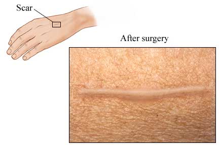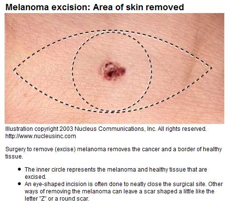 After surgery to remove a melanoma, the skin may be closed with stitches for a small excision. If the excision was large, a skin graft may be needed. This picture below shows an example of the usual shape of the scar after surgery to remove a small melanoma.